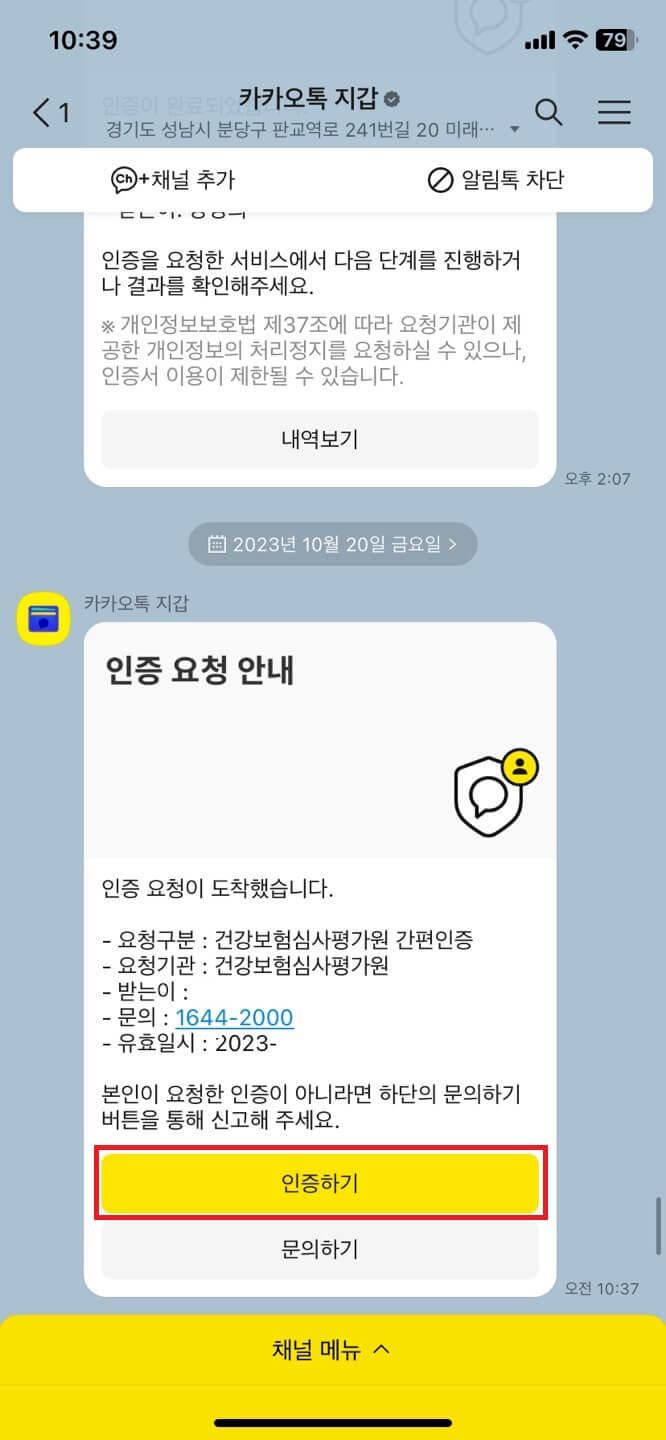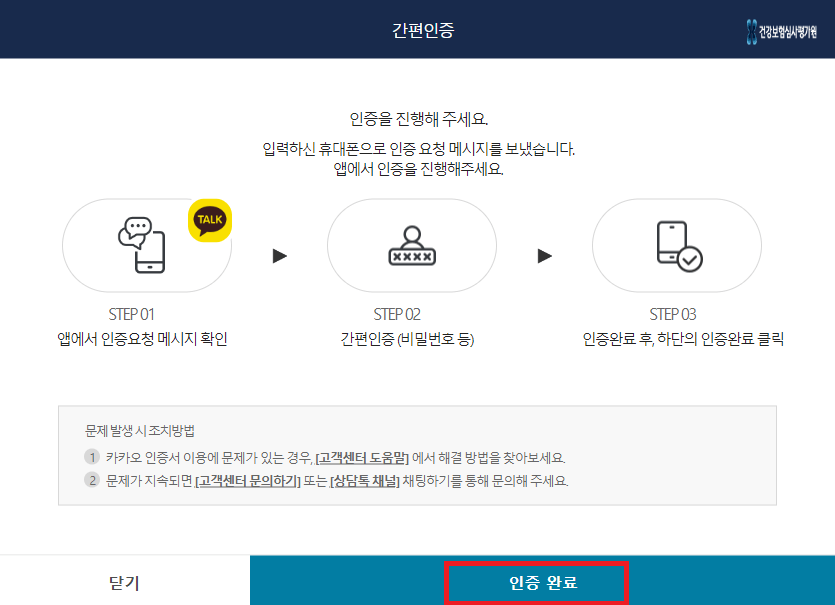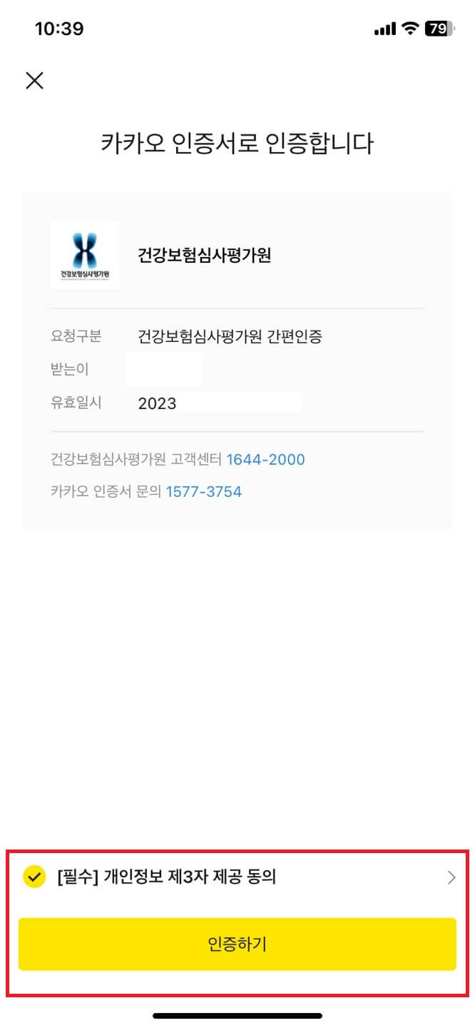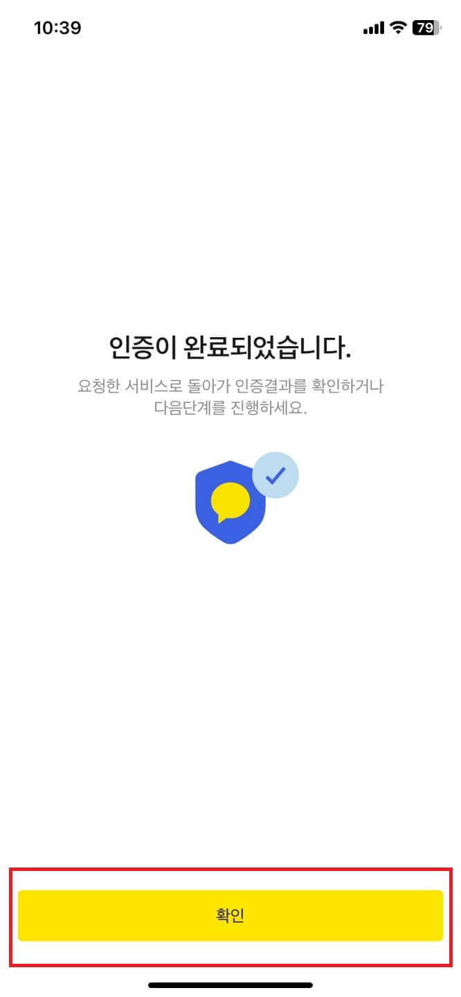 6. 그럼 모바일로 인증 카카오톡이 오는데 인증하기-개인정보 동의 체크 후 인증-완료되면 확인 버튼을 누릅니다.