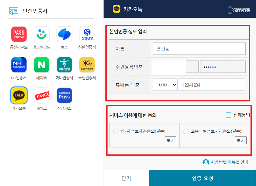 5. 카카오톡으로 인증방법을 선택하신 분들은 개인정보를 입력 후 서비스 이용용에 대한 동의를 체크합니다.