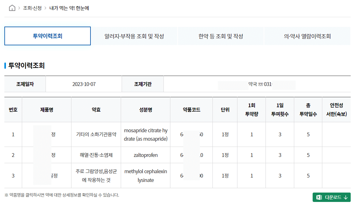8. 약국을 누르면 상세 정보를 조회할 수 있는데요. 아래 사진에서 볼 수 있듯이 처방받은 약 정보가 자세히 나오는 것을 확인할 수 있습니다. 엑셀로 다운로드를 할 수도 있어 저장해 두고 사용할 수도 있습니다.