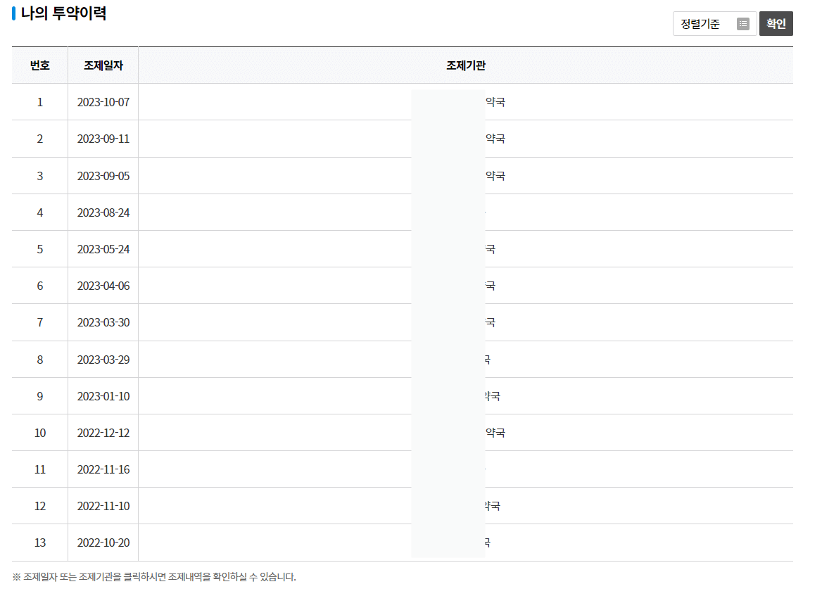 7. 다시 홈페이지로 돌아와 인증 완료를 누르면 최근 1년 동안 조제받았던 날짜와 약국의 정보가 조회됩니다.