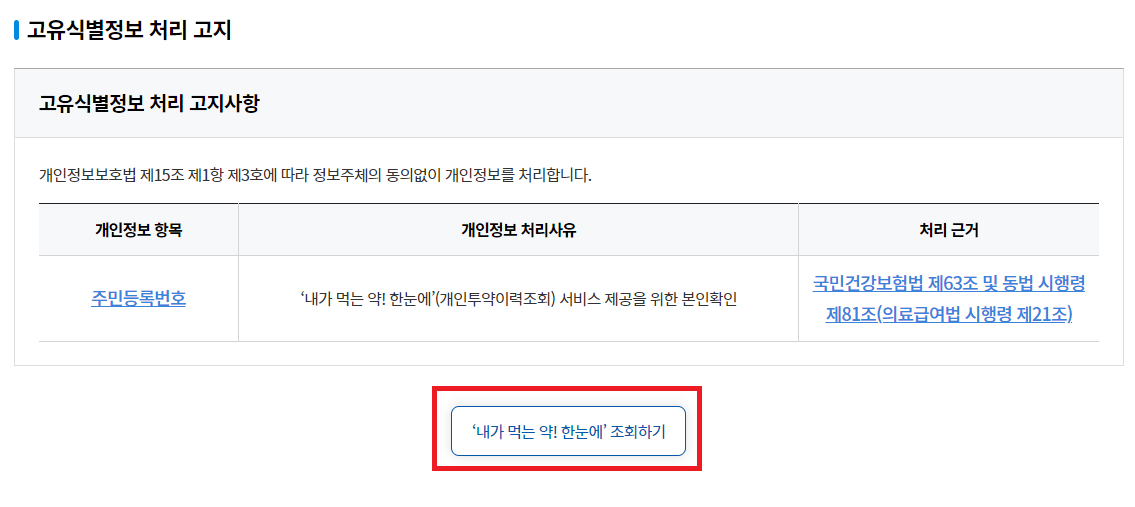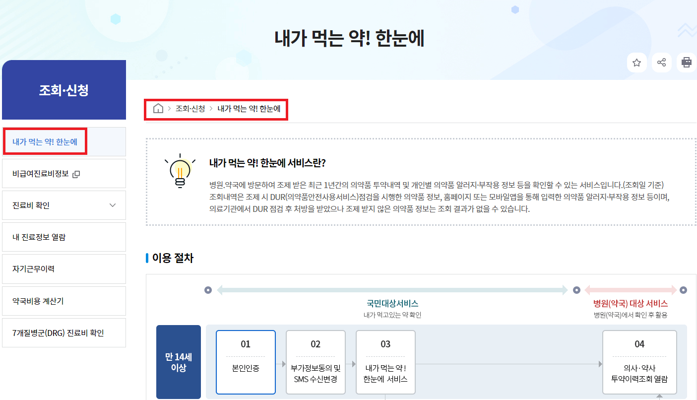 2. 조회 신청-'내가 먹는 약! 한눈에' 메뉴에서 이용절차를 확인합니다.