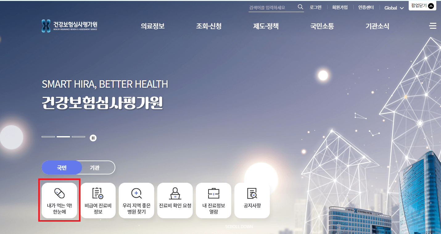 1. 우선 건강보험심사평가원 홈페이지를 방문합니다. 왼쪽 하단에 '내가 먹는 약! 한눈에' 메뉴를 클릭합니다.