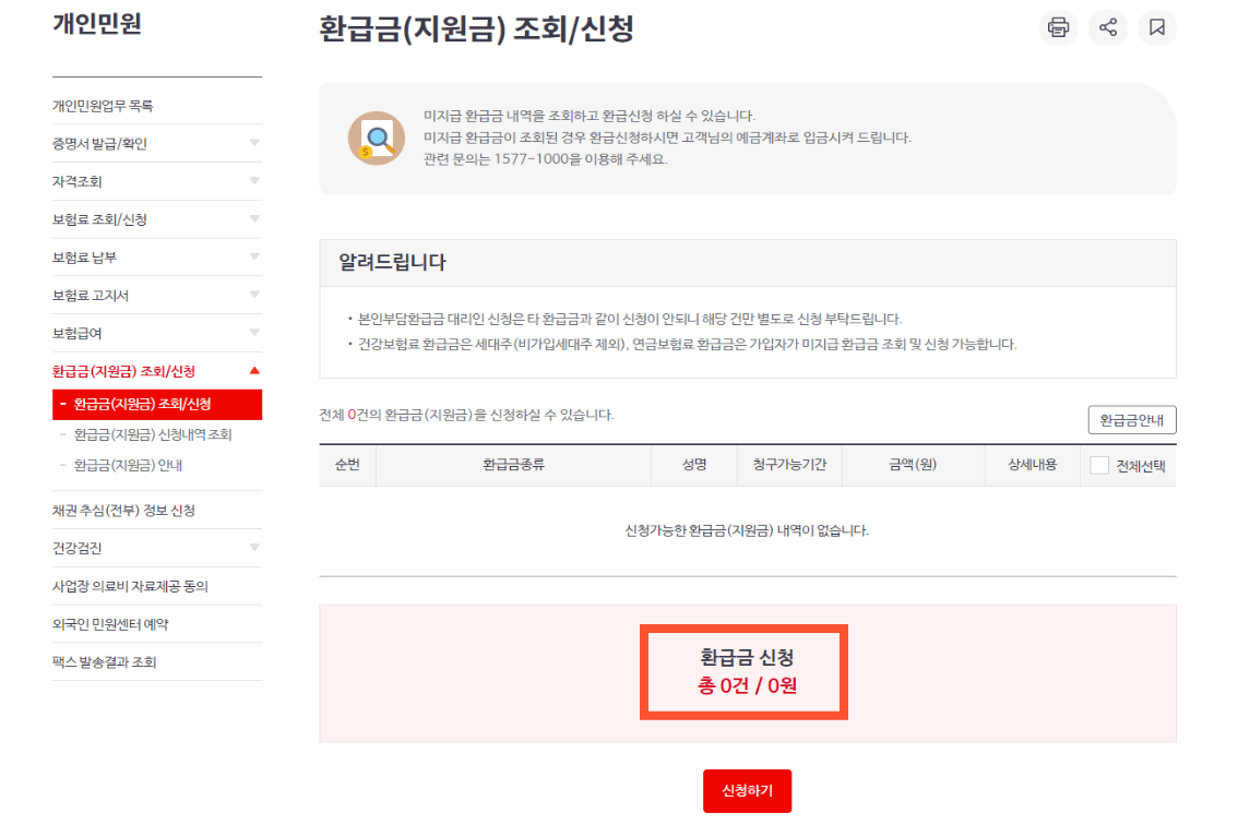 본인 인증이 완료되면 환급금(지원금) 조회/신청 페이지로 넘어갑니다. 환급금이 있으면 신청 건수와 금액이 나오는데요. 저는 환급금액이 없어 0건이라고 뜨네요.