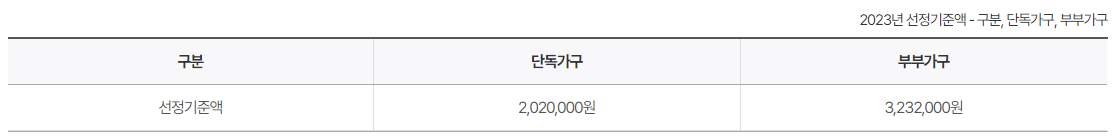 만 65세 이상의 대한민국 국적을 가지고 있으며 국내에 거주하는 어르신이 해당됩니다. 소득인정액 선정 기준 금액 이하인 분들이 해당됩니다. 단독가구 및 부부가구로 나누어져 있고 소득인정액 선정기준액은 아래와 같습니다.