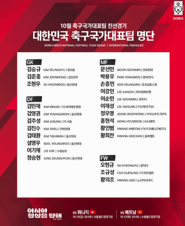 10월에 베트남과 튀니지와 경기를 펼치게 됩니다. 보통은 A매치 주간에 2경기가 펼쳐지는데 10월 13일, 10월 17일 2번 진행하게 됩니다.
