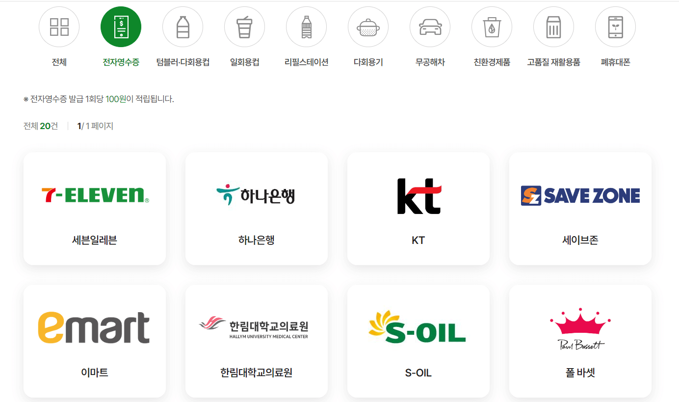 전자영수증을 받는 방법도 참여기업 중 자신이 사용하고자 하는 기업을 선택해 회원가입 후 탄소중립포인트와 관련된 설정을 해 주시면 됩니다. 해당 기업의 회원가입 및 로그인은 필수이고 회당 100원 적립이 가능합니다.